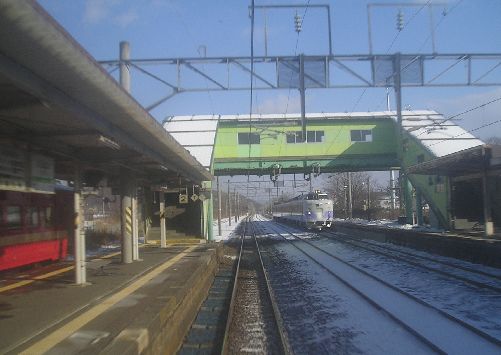↑特急「スーパー北斗」号の車窓から/白老駅を通過。