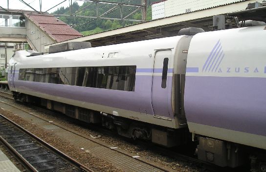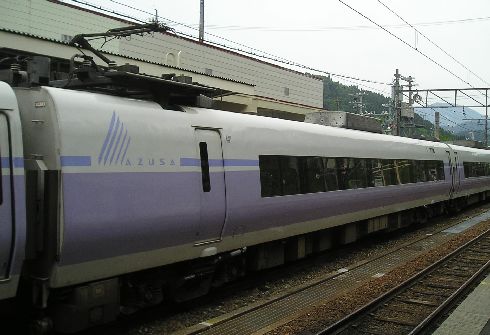 ↑特急「スーパーあずさ」号/大糸線 南小谷駅にて