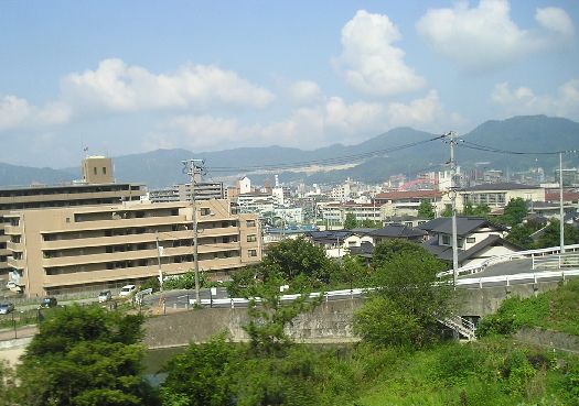↑急行「みよし」号の車窓から/志和口→広島。広島の住宅街・市街に入ってきました。