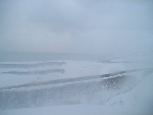 ↑宗谷本線・普通列車の車窓から/勇知→南稚内。晴れていれば利尻島まで見渡せる日本海も海岸線を微かに見るのがやっと。
