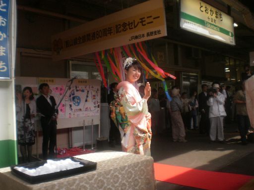 ↑「飯山線全通80周年」号の車窓から/十日町→津南。十日町駅出発前に セレモニーが行われました。