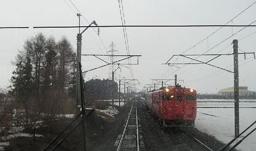 ↑リゾートしらかみ号の車窓から/奥羽本線 弘前→川部 深浦からの快速とすれ違い