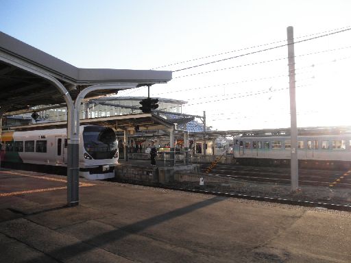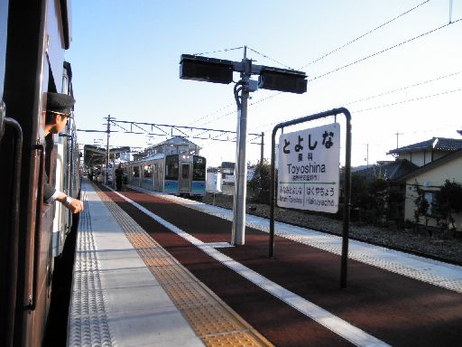 ↑「レトロ大糸線」号の車窓から/穂高→松本。穂高駅に停車。