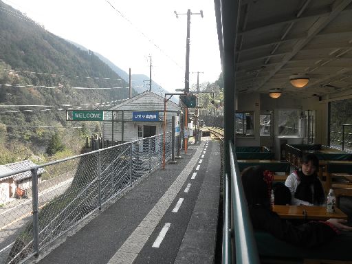 ↑「大歩危トロッコ」号の車窓から/大歩危→小歩危。小歩危駅に停車。