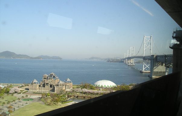 ↑瀬戸大橋からの車窓。橋の真下数十メートルのところに海面が見えます。