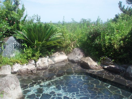 ↑浜村温泉/浜村温泉館の露天風呂。向こうに日本海が見えます。